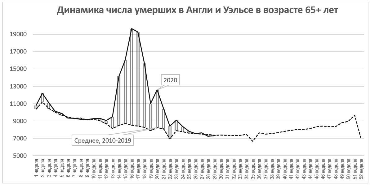 Рис. 12. Динамика числа умерших в возрасте 65+ лет, по неделям. Англия и Уэльс