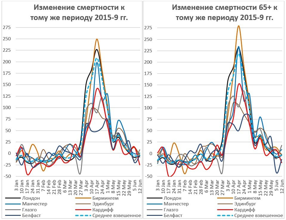 Рис. 13. Динамика избыточной смертности в городах Великобритании