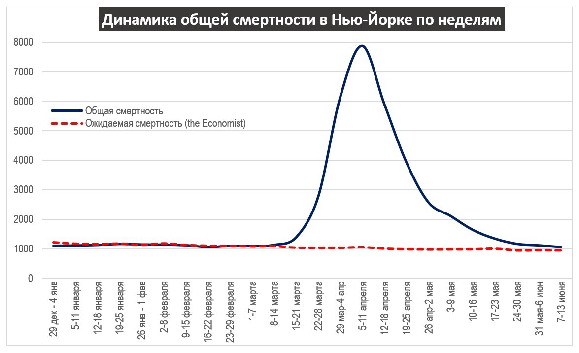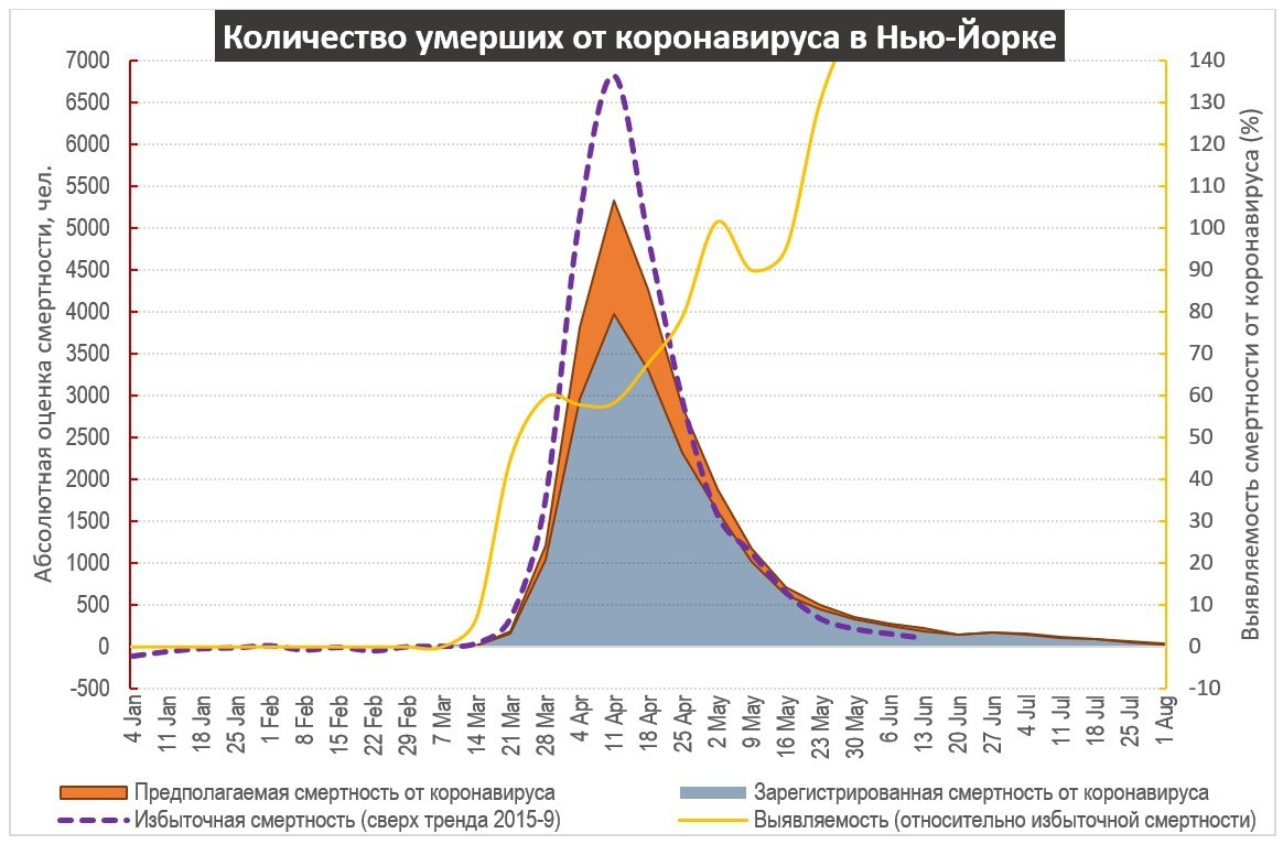 Рис. 16. Динамика избыточной смертности в Нью-Йорке, а также зарегистрированные смерти от коронавируса