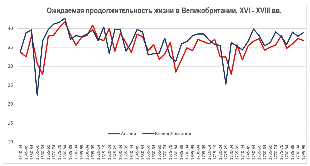 В Великобритании в Новое время ОПЖ чаще всего колебалась в интервале 35-40 лет[9]. По Англии точно так же, как и сейчас, у нас есть подробные данные и в доиндустриальный период. Забегая вперед, скажу, что именно на их основании мы будем калибровать понятие демографической катастрофы и серьезности того или иного шока для доиндустриального общества. Пока же рассмотрим динамику показателя ожидаемой продолжительности жизни в Великобритании.
