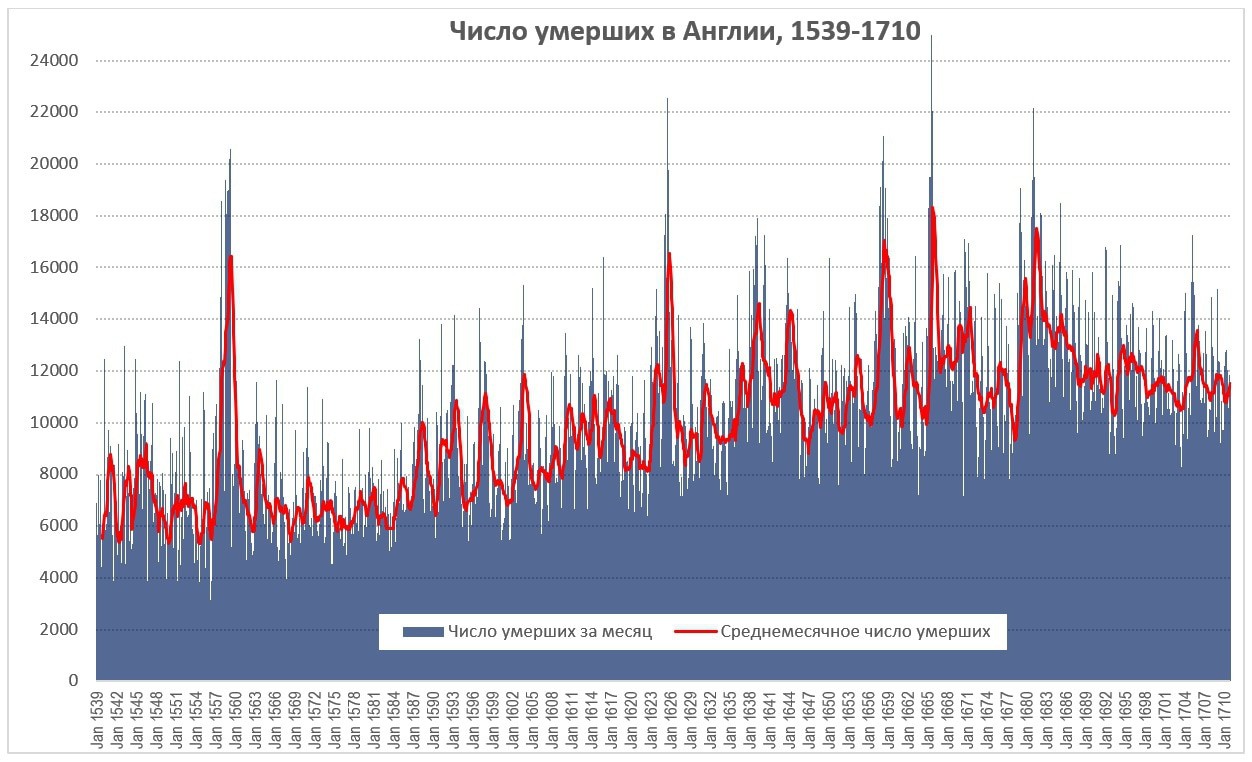 Как мы видим, всплесков смертности довольно много. Если не считать малозначимые всплески смертности, то можно выделить несколько главных пиков. Это скачок смертности в 1557-1560 гг., вызванный пандемией гриппа, 1625-6 – чума, 1665-6 – великая эпидемия чумы, закончившаяся с лондонским пожаром, и ряд вспышек, предшествовавших и следовавших за ней, тоже вызванных чумой.