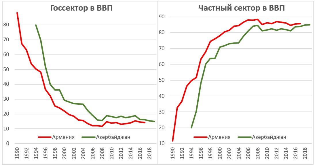 В 2019 году доля частного сектора в Азербайджане составила 85% ВВП. В Армении она составила 85.7% в 2017 году (последние данные). Вряд ли мы можем говорить о том, что между Арменией и Азербайджаном в уровне приватизации есть разница или по крайней мере она сколько-либо существенна. Да, Азербайджан отстал в приватизации в 1990-ых гг и в первой половине 2000-ых, но сейчас эта разница нивелирована.