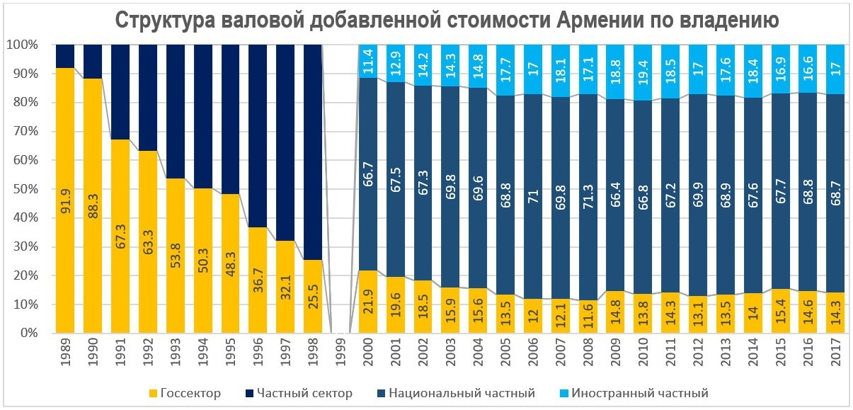 К сожалению, у нас нет аналогичных данных по Азербайджану, есть лишь доля государственного и частного сектора в ВВП. Сравним с динамикой по Армении.