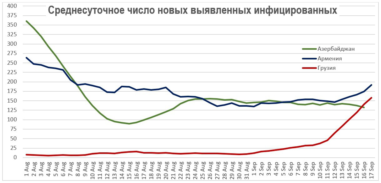 Как мы видим, распространение вируса действительно ускорилось. Но более того, число активных случаев растет практически экспоненциально: 3 сентября это было 270 человек, 10 сентября 477, 17 сентября 1470. Чтобы сдержать распространение болезни, в Грузии активно проводится тестирование. Вчера было проведено 14 тысяч тестов, а вообще объемы тестирования практически беспрецедентные. Всего Test Positivity Rate составляет 0.57%, то есть на одного обнаруженного инфицированного за все время около 176 тестов, а вчера этот показатель составлял 81, что тоже очень хорошо. Большой объем тестирования – одно из множества средств, позволяющих Грузии не допустить стремительного роста числа инфицированных. За весь период на одного положительного в Грузии было сделано в среднем 176 тестов, в Азербайджане 26.6, в Армении 5.4. Соответственно, в Азербайджане доля позитивных тестов составляла 3.8%, а в Армении – 18.5%.