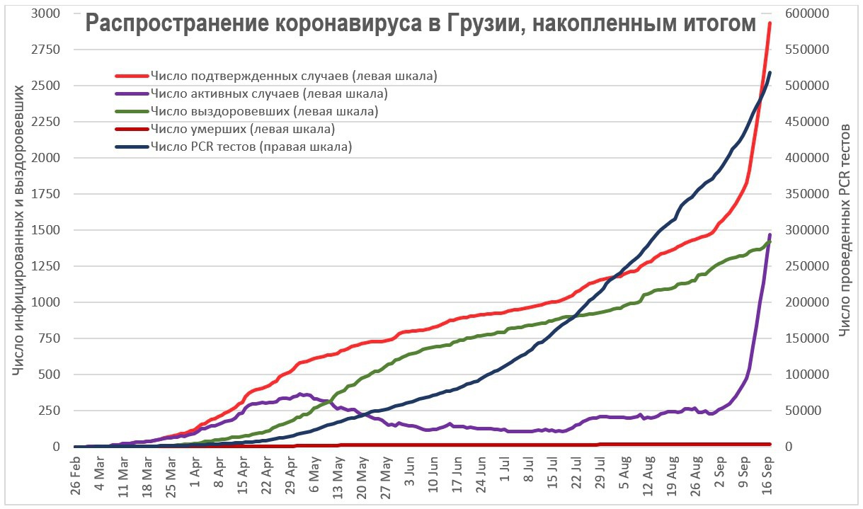 На данный момент распространение коронавируса в Грузии происходит высокими темпами. За последние две недели в Грузии было зарегистрировано столько же случаев коронавируса, сколько за предыдущие полгода. Некоторые считают, что именно сейчас в Грузии и начинается «первая волна» коронавируса. Если учитывать, что до сих пор распространение эффективно сдерживалось, то это так и есть. Однако если рассматривать волны хронологически, то это вторая волна. Просто в Грузии сумели сдержать первую волну на примерно 99.5% относительно тех 7% населения, которые были во многих странах, где было большое распространение ковида.