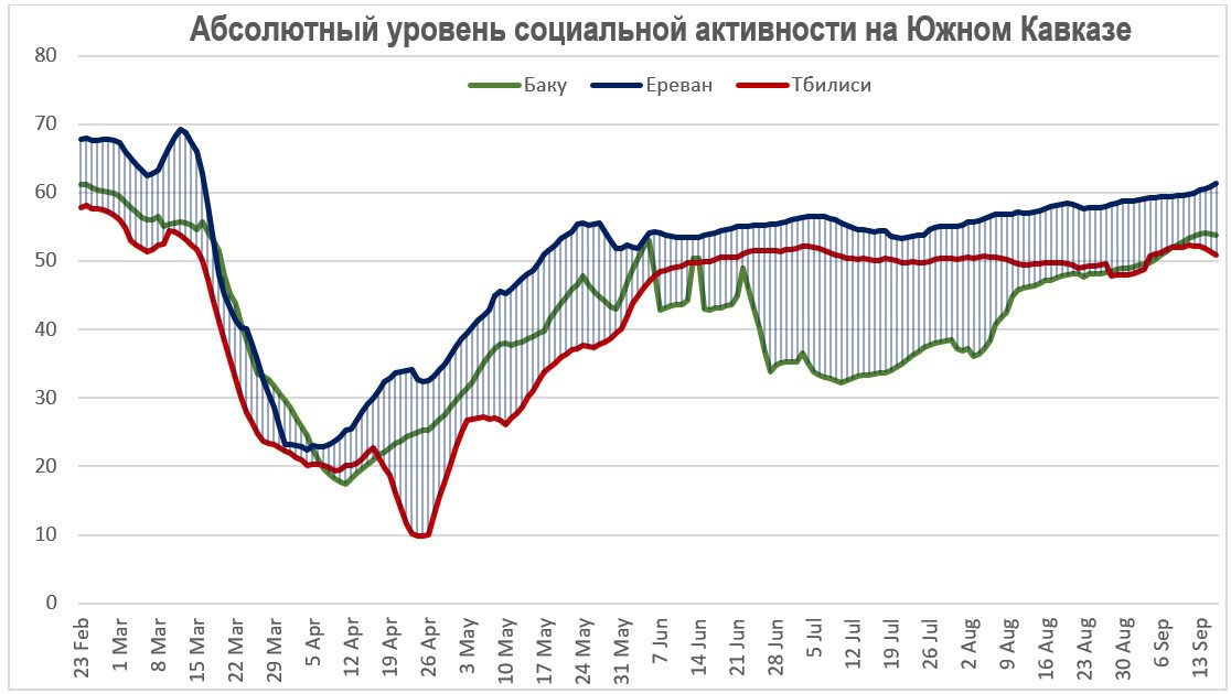 Здесь мы видим, что карантин был в Грузии глубже и дольше, чем в соседних странах, что позволило в июне-августе напротив восстановить почти до допандемического уровня социальную и, как следствие, экономическую, активность. Это удалось сделать в большей мере, чем у соседей, где из-за большого распространения ковида это не удавалось сделать. Однако это график относительной активности, где показатели для каждого города сопоставимы между собой, но не вполне сопоставимы с другими городами. К примеру, в Ереване уровень социальной активности выше, чем в Тбилиси и Баку (что также стало причиной ускоренного распространения ковида). Имея данные по индексу самоизоляции, который раньше рассчитывал Яндекс и индексу активности, который он рассчитывает сейчас, я рассчитал абсолютный уровень социальной активности на Южном Кавказе. Он представлен на графике ниже.