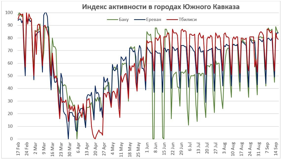 Как мы видим, в Тбилиси весенний карантин был глубже и дольше, чем в Ереване и Баку, причем в Баку пришлось вводить второй карантин уже летом, тогда как в Ереване решили придерживаться «шведской стратегии», о чем говорят и высказывания типа «в конце мы увидим, кто лучше справился», точно повторяющие слова главного эпидемиолога Швеции Андерса Тегнелла в его интервью на Hard Talk. Рассмотрим, насколько сильным было ограничение социальной активности на Южном Кавказе на практике.
