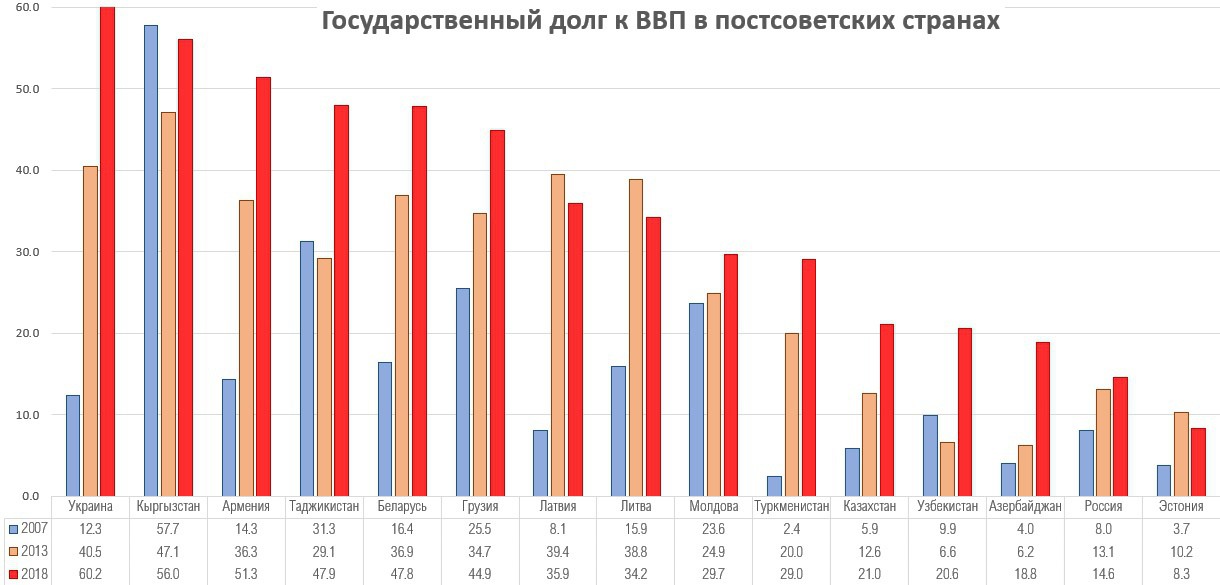 Если посмотреть на государственный долг Армении в контексте, то лучше всего это делать на постсоветском пространстве. Все страны начинали с нулевого долга, кроме России, взявшей на себя имущество и долги СССР. Впрочем, часть долгов России простили, так что изначальная долговая нагрузка для России, хотя и была большой, но довольно быстро сократилась. На постсоветском пространстве ситуация у Армении не лучшая. В 2007 году Армения была на 7 месте по соотношению госдолг/ВВП, в 2013 году на 6 месте, а в 2018 уже на третьем.
