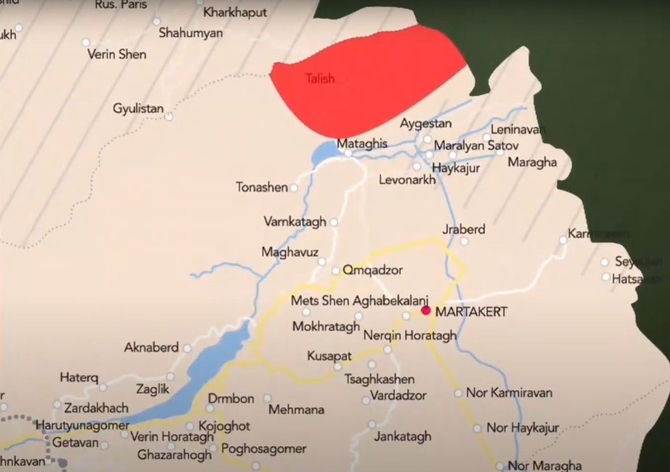 Синими кружками отмечены места столкновений, красными - места, где азербайджанская армия закрепилась. Далее - северный фланг столкновений. По утверждению Министерства обороны Армении, Азербайджан контролирует только село Талиш Мартакертского района, тогда как село Матагис находится вне зоны контроля Азербайджана или под контролем НКР. Также, по утверждению Минобороны Армении, на Мравском хребте нет точек, подконтрольных Азербайджану.