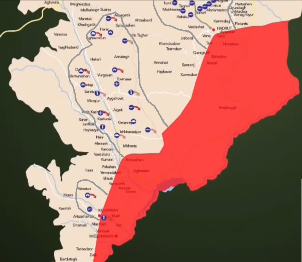 Так выглядит южный фланг. Синими кружками опять же отмечены зоны боев, красными стрелками - предполагаемое отступление Азербайджана, а я серыми линиями выделил "зону боев", определенную МО Армении.