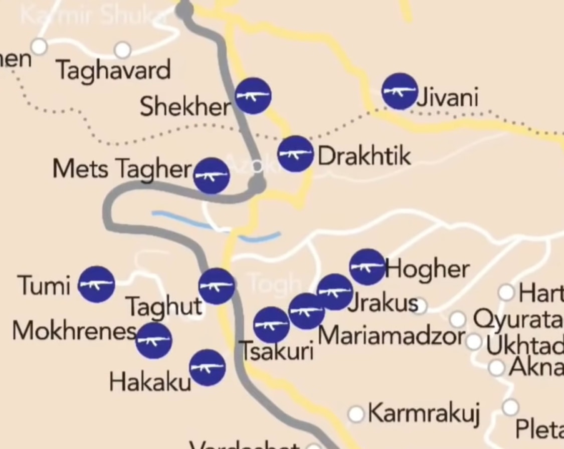 Ниже эта же зона в большем приближении. Гадрутский район: она доходит до сел Шехер и Дживани, где 23 октября были столкновения, а также включает в себя села Мец Тагер, Драхтик и другие, откуда армянские силы уже вышли.