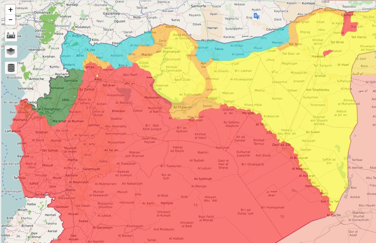 Голубым цветом отмечены турецкие оккупационные зоны в Сирии, занятые в ходе трех последовательных антикурдских операций. Зеленым цветом отмечена зона преимущественного турецкого влияния в Идлибе.