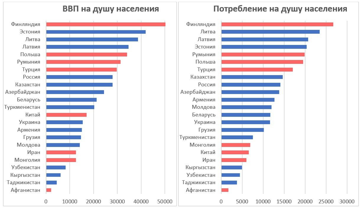 График 2. ВВП и потребление на душу населения постсоветского пространства и соседних с ним стран в 2019 году, с учетом наличного населения