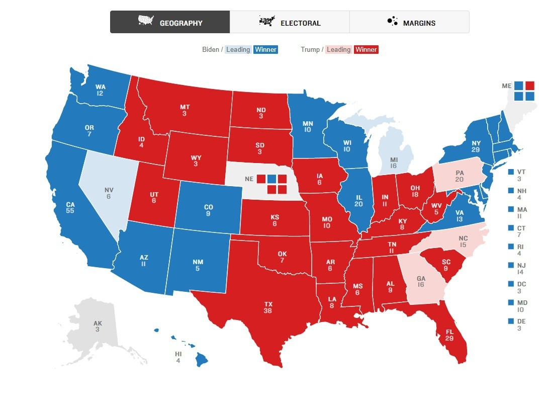 Карта результатов голосования по состоянию на данный момент. Карта NPR