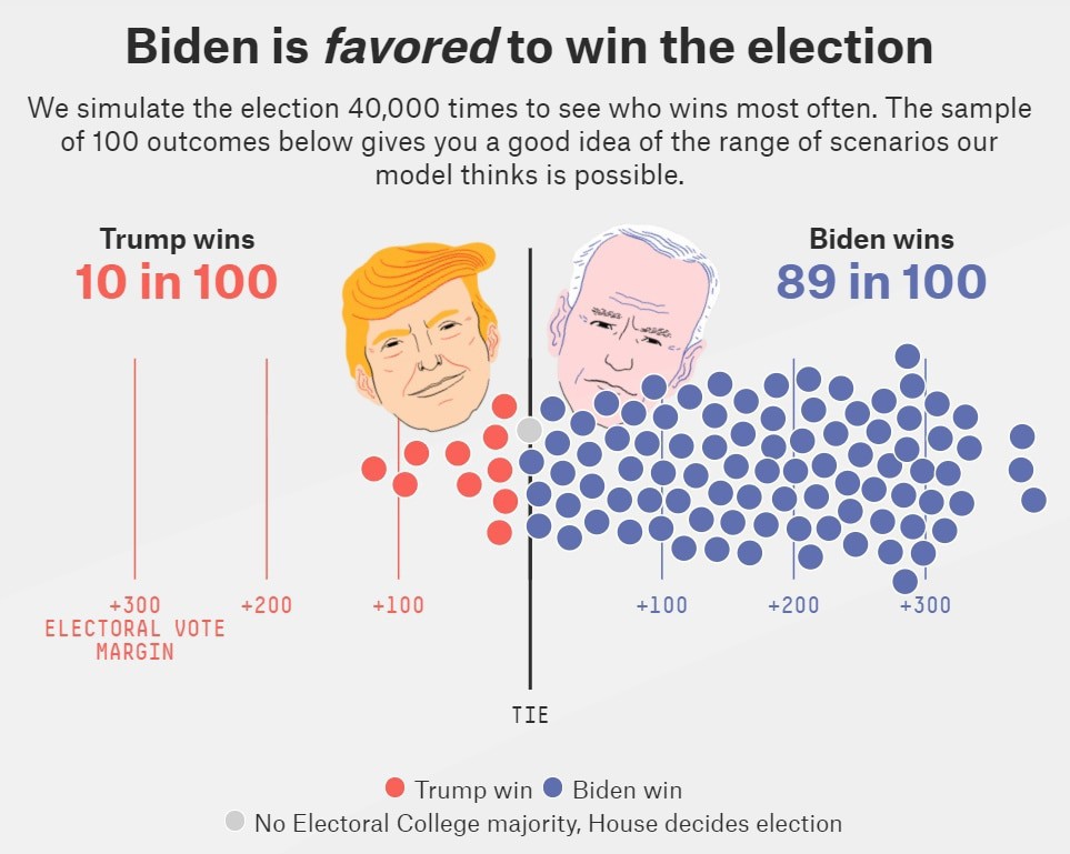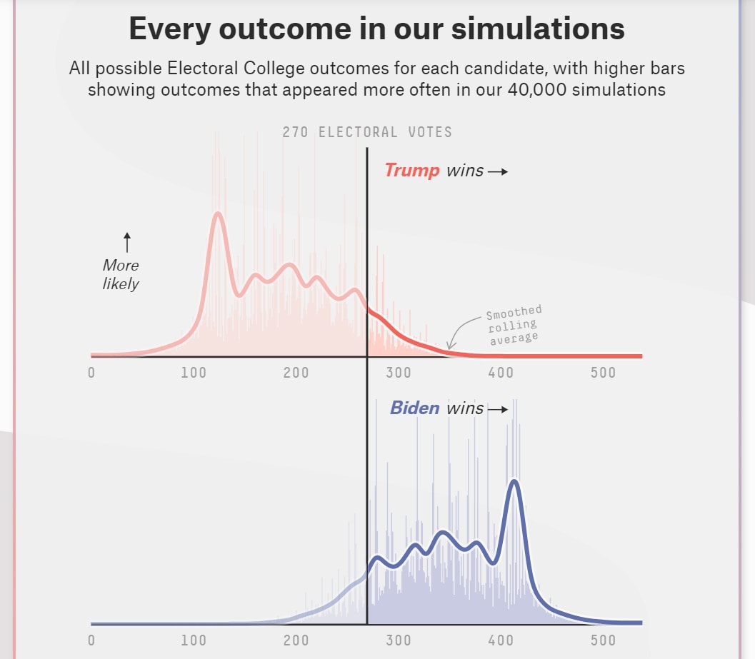 Подробные результаты симуляций от проекта fivethirtyeight. Мода у Байдена в районе 415 выборщиков при 270 необходимых для победы