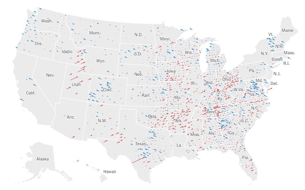 Карта изменения результатов голосования в 2020 году относительно 2016 года. Стрелки означают направление изменения, цвет – красный-в пользу республиканцев, синий-в пользу демократов. Карта New York Times