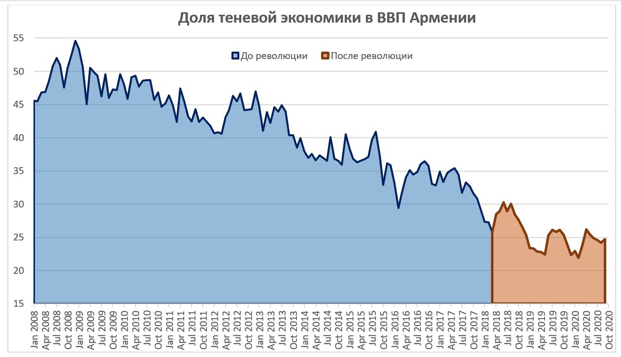 В Армении уровень преступности был довольно низким до «Бархатной революции» и начал расти после революции, причем не скачкообразно, но поменялся тренд, и уровень преступности, до того снижавшийся, начал расти после именно вследствие проводимой властями кадровой и институциональной политики. Полиция, к примеру, была структурой, которую революционеры не любили, так как именно с ней имели дело как участники акций протеста в прошлом. Другим показателем может быть динамика теневой экономики, тоже характерным показателям уровня развития институтов.
