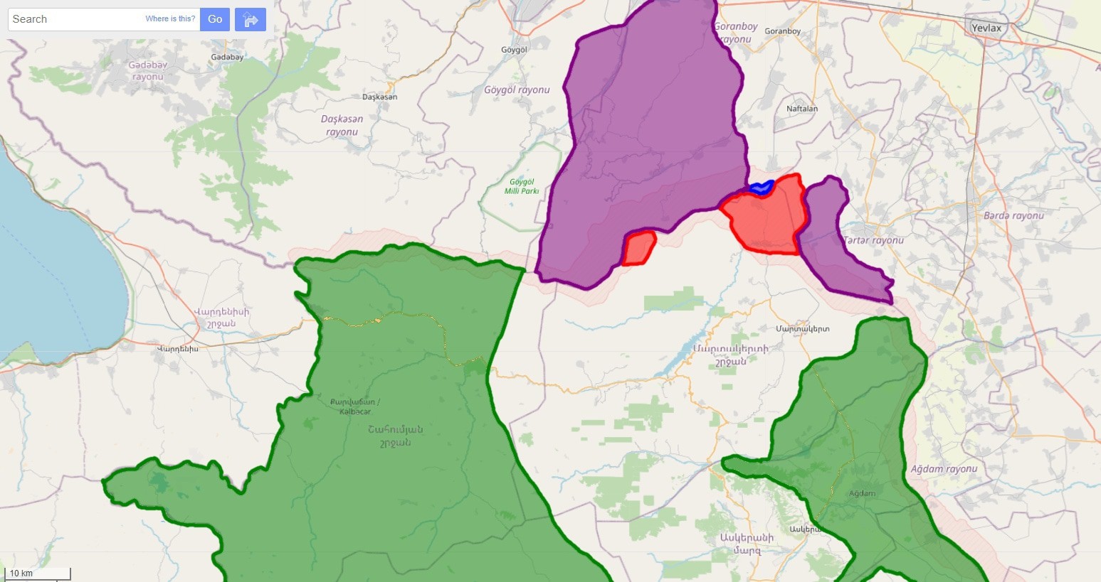 На севере ситуация выглядит следующим образом. Фиолетовым цветом отмечены территории, потерянные в ходе войны 1990-ых гг., часть Мартакертского района и Шаумяновский район, включая подрайон Геташен-Мартунашен. Синим цветом отмечена территория, потерянная в 2016 году. Красным цветом – в 2020 году. Зеленым цветом отмечены территории, которые без боя перейдут под контроль Азербайджана.