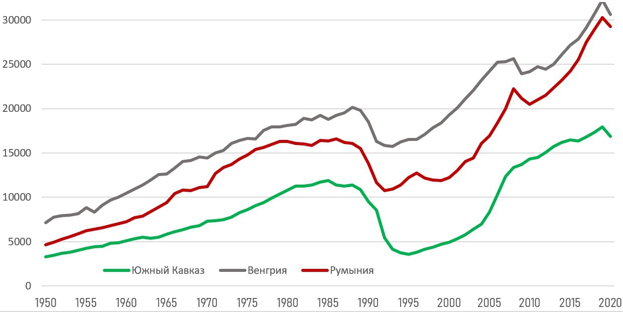 * Источники по экономической динамике: авторские расчеты с коррекцией на основе статистических сборников «Народное хозяйство СССР», «Народное хозяйство Армянской ССР», «Народное хозяйство Грузинской ССР», «Народное хозяйство Азербайджанской ССР» за 1970-1988; Soviet Republics Statistical Handbook (World Bank) за 1993-1997; Conference Board Total Economy Database; World Bank World Development Indicators; IMF World Economic Outlook, October 2020 Database; Maddison Project Database 2020; World Bank International Comparison Program 2017;