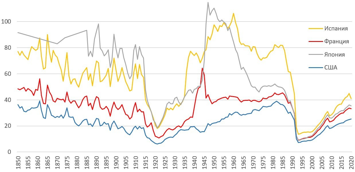 На сегодня подушевой ВВП Армении в сопоставимых ценах составляет 40% от испанского, 35% от японского, 33% от французского и 25% от американского. Если посмотреть на график в длинной перспективе, это хуже, чем было в XIX и XX веках, когда 40% от французского ВВП для Армении было нормой. Однако долгосрочное стабильное развитие способно вывести страну как минимум на эти позиции во вполне обозримой перспективе.