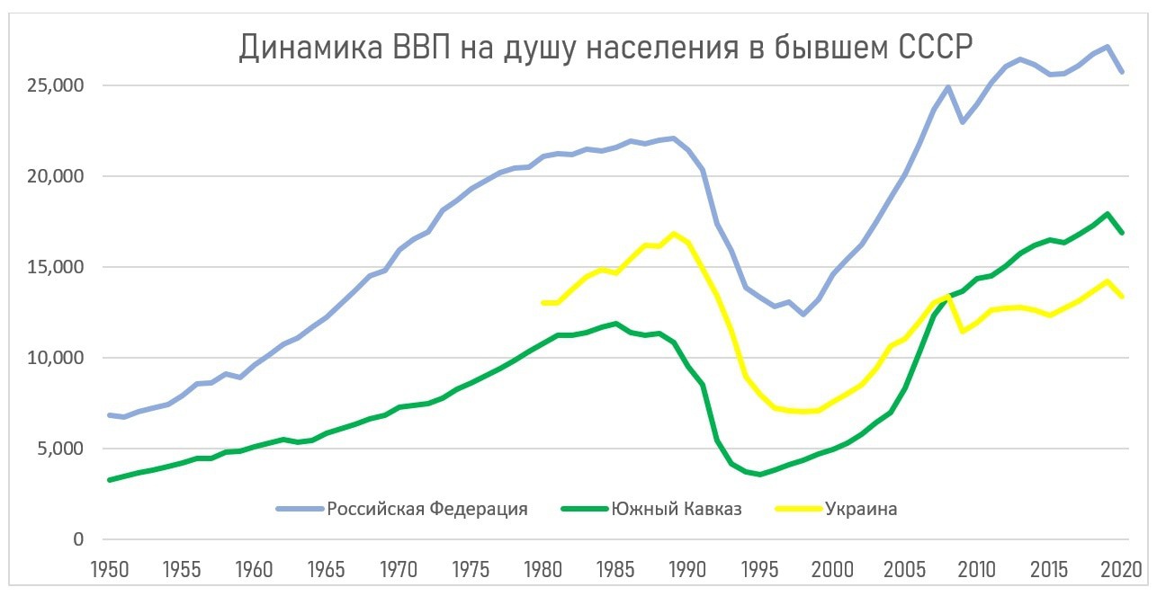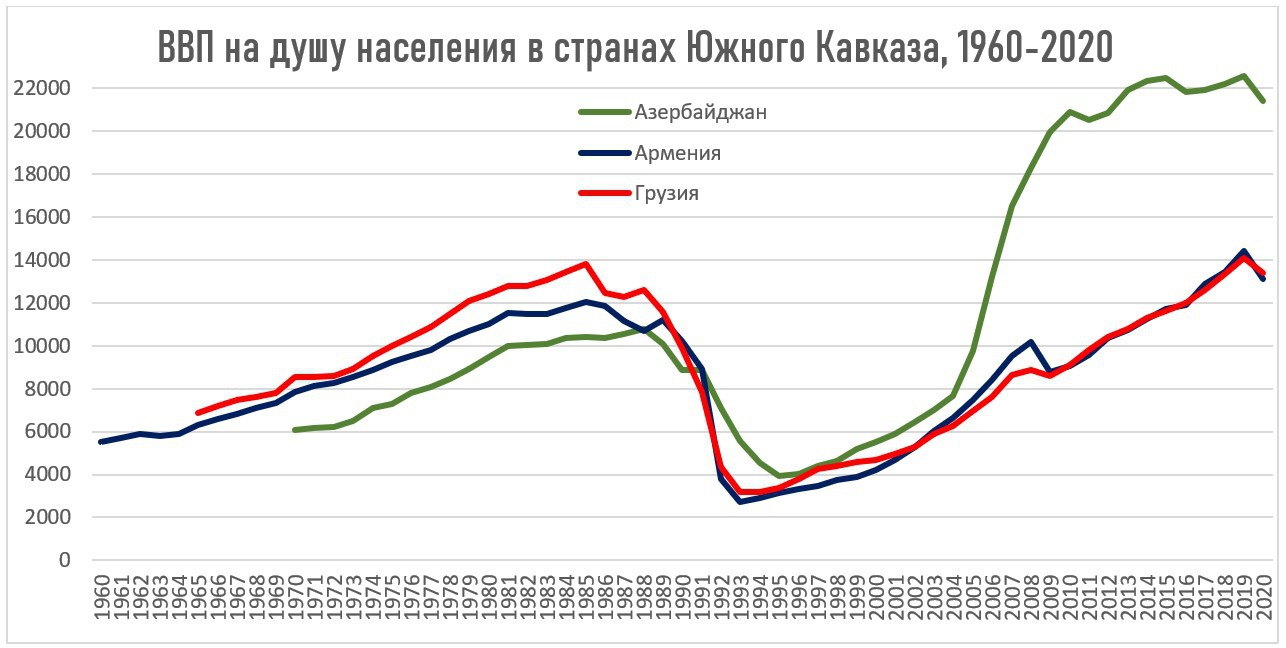 На фоне развала общего рынка, трансформации к капитализму, прекращения дотаций из центра, шоковой терапии и в целом часто ошибочной политики новых независимых стран, экономика начала разваливаться, что усиливалось вооруженными конфликтами и разрывом коммуникаций. Вслед за этим начался восстановительный рост, прерываемый кризисами 2008/9 и 2020 гг., а в Азербайджане начиная с 2005 года произошел скачок благодаря открытию трубопроводов БТД, БТЭ, Баку-Супса, росту добычи нефти на месторождении АЧГ, и росту цен на нефть. Экономические показатели Армении и Грузии, как мы видим, при корректном расчете численности населения, практически идентичны на протяжении всего периода независимости.