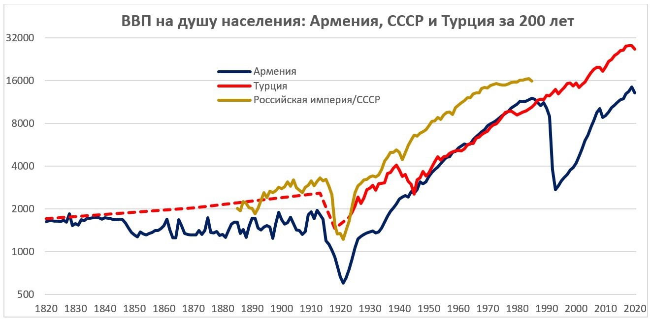 Сравнение Турции с Арменией, на мой взгляд, самое интересное и показательное, особенно с учетом последних событий в регионе. Это сравнение интересно также тем, что его можно провести на более длительном интервале, начиная с XIX века.