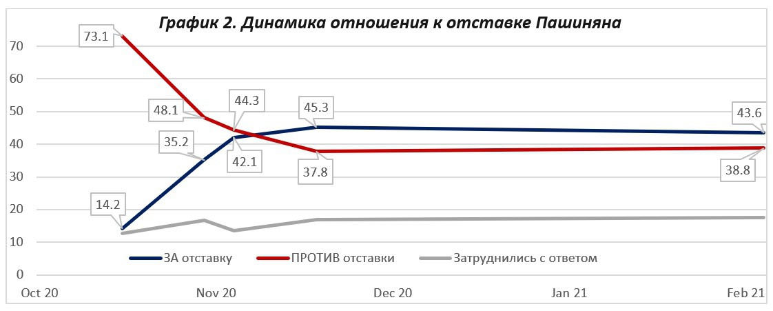 По вопросу об отставке Пашиняна, мнения во многом разделяются с преобладанием противников Пашиняна. Так, его отставки требуют 43.6%, а 38.8% считают, что Пашинян должен продолжать руководить страной. Причем разрыв даже несколько сократился за последние месяцы.