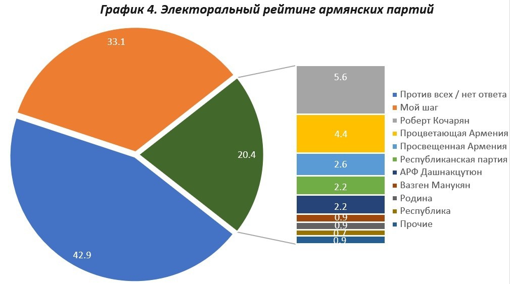 Если выборы прошли бы сегодня, 33.1% опрошенных проголосовали бы за блок «Мой Шаг» (правящая партия), еще 27.2% - ни за кого, 15.7% затруднились с ответом, все остальные субъекты вместе получили 23.8%. Из них почти 20% можно условно отнести к объединенной оппозиции из 17 партий, требующих отставки Пашиняна в ходе уличных акций.