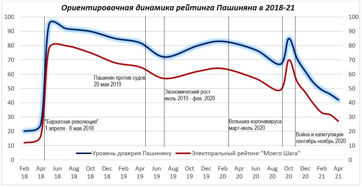 Следующий вопрос касается того, за кого готовы проголосовать избиратели. По последнему опросу, блок Пашиняна «Мой шаг» набирает 27.2% голосов, хотя два месяца назад таковых было 33.1%: 58% поддерживают проведение внеочередных выборов в Армении: соцопрос. Обновим использованный там график с использованием данных за март и апрель. В конце марта рейтинг Пашиняна составлял 31.7%, таким образом за месяц он спустился на 4.5%. Также, в графике уточнены данные за ноябрь и декабрь 2020 года, когда, судя по всему, в начале рейтинг снижался медленнее, чем казалось раньше. На графике отражены также основные тенденции и события, повлиявшие на рейтинг.