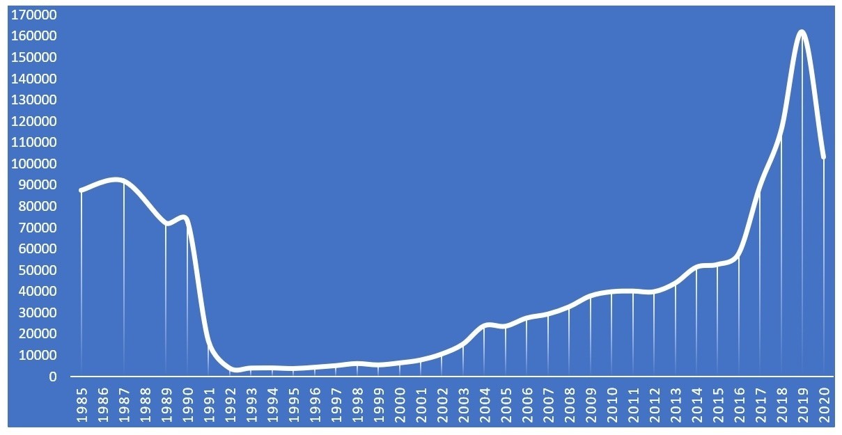 График 3. Динамика производства сельского хозяйства в постоянных ценах 2020 года, млн. драм., 1985-2020