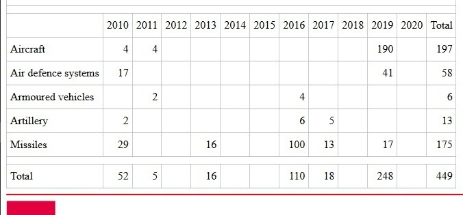 Таблица 2. Импорт вооружения в Армению по типам вооружения, БД Стокгольмского института исследования проблем мира