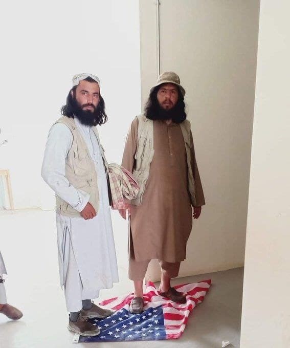 15-16 августа, талибы заняли американскую базу Баграм и топчут флаг. В том числе во избежание повторения, во время эвакуации посольства, американцы вывозят все вещи, содержащие какую-то символику США.