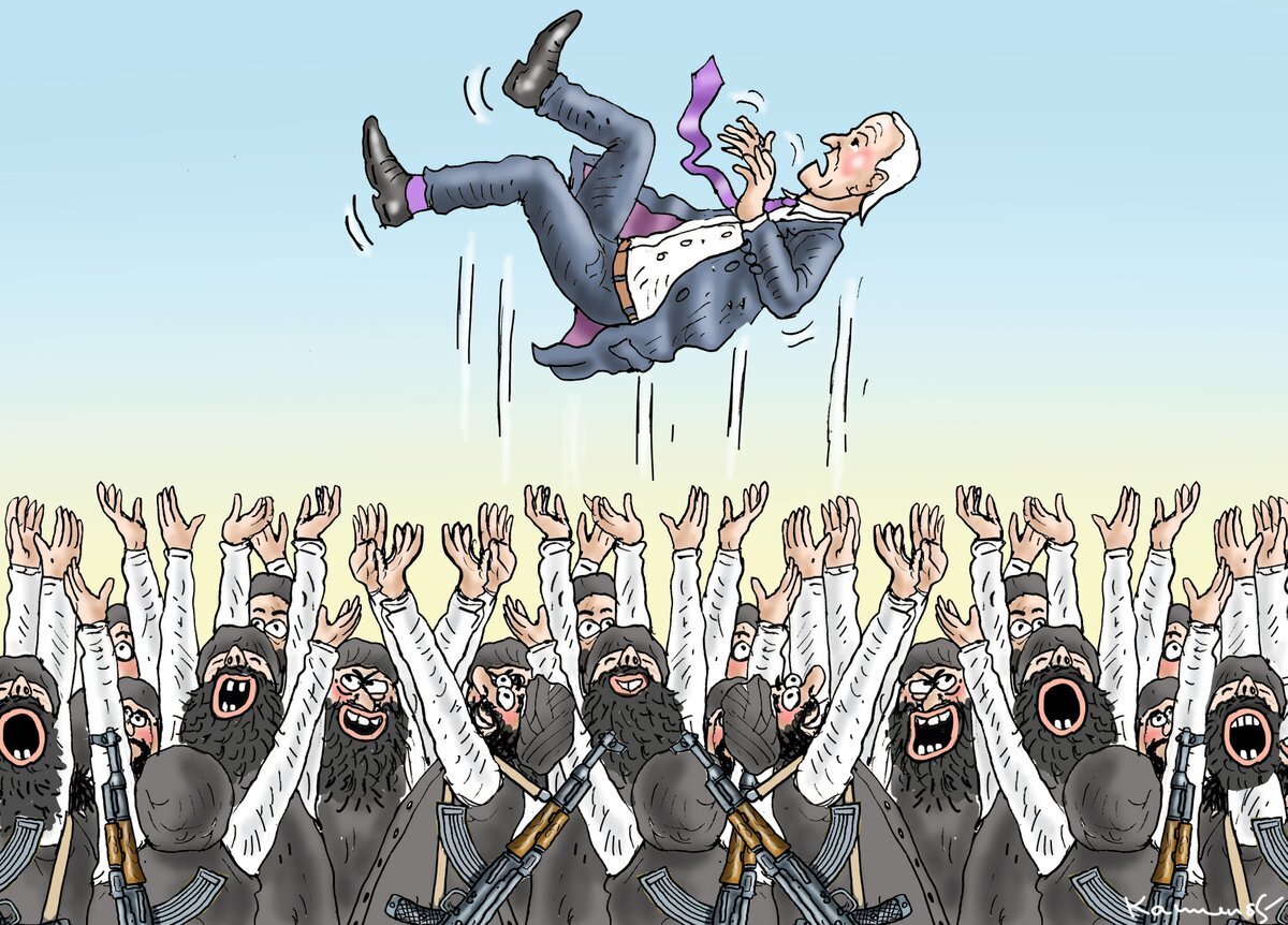 Это во многом внутриамериканский дискурс (хотя и не только), где республиканцы обвиняют Байдена в том, как он вывел войска и тем самым содействовал талибам. На карикатурах он изображается преклоняющимся перед ними, а талибы - его горячими сторонниками. Приведем несколько примеров.