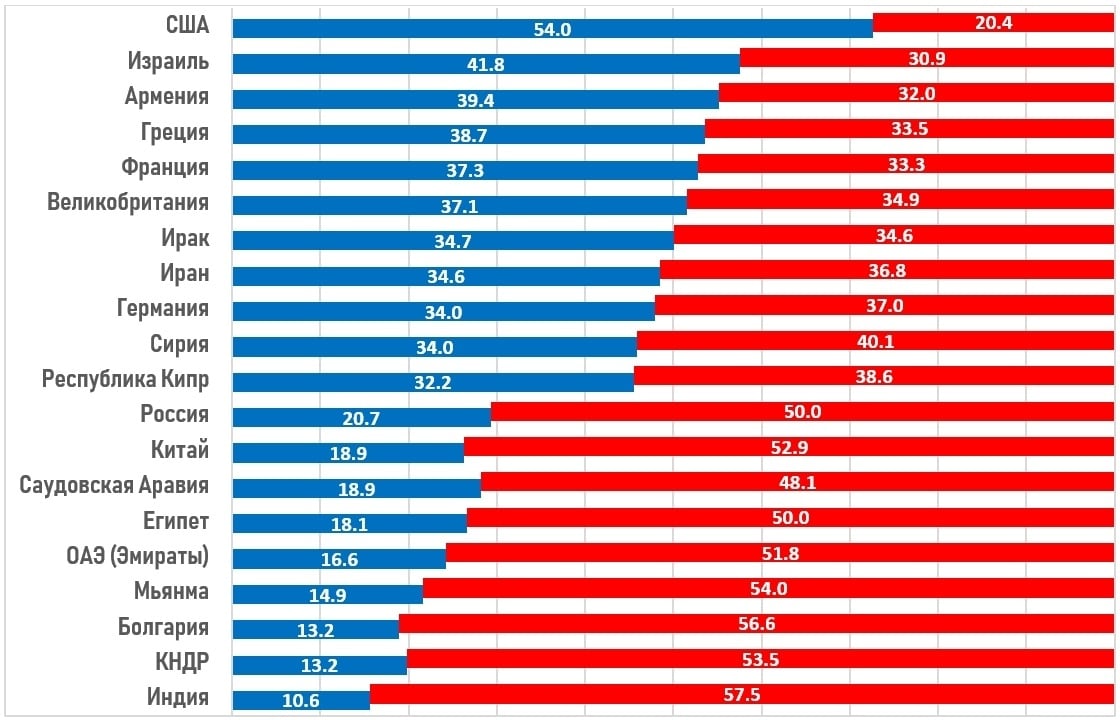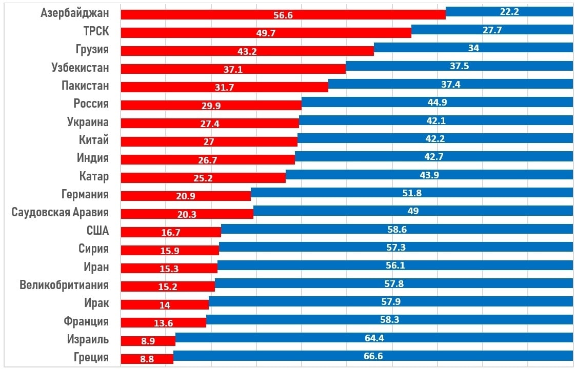 *Примечания: красным цветом отмечены страны, относительно которых жители Турции согласились, что эти страны являются дружественными, а синим – по которым не согласились. Нейтральные ответы и неопределившиеся не включены в график, но могут быть определены по остаточной доле от 100%.