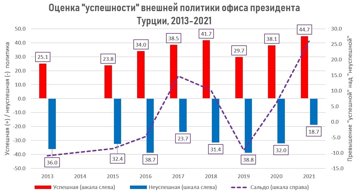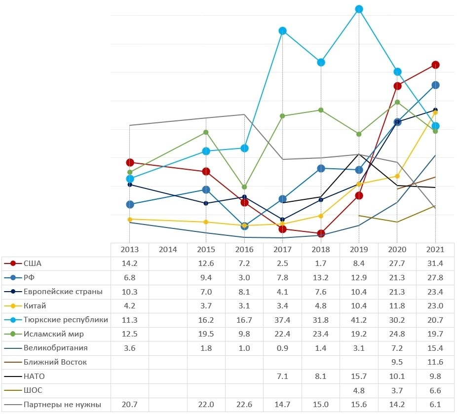 Характерно, что в последние годы резко вырос интерес к сотрудничеству с США (на 30% за 3 года), к Китаю (на 18%), к европейским странам (на 16%) и Великобритании в частности (на 14%), а также России (14.6%), в то же время число людей, считающих, что Турция должна проводить внешнюю политику без того, чтобы как-то кооперироваться с другими странами, заметно сократилось, хотя к 2013 году это была доминирующая точка зрения. Можно предположить, что в Турции есть некоторая усталость от пантюркизма и панисламизма Эрдогана и желание выйти из внешнеполитической изоляции, снизить уровень конфликтности во внешней политике. Это умозрительный вывод, который потребует дальнейшей проверки. Примечательно и то, что восприятие Ирана как враждебной страны резко снизилось в 2021 году.