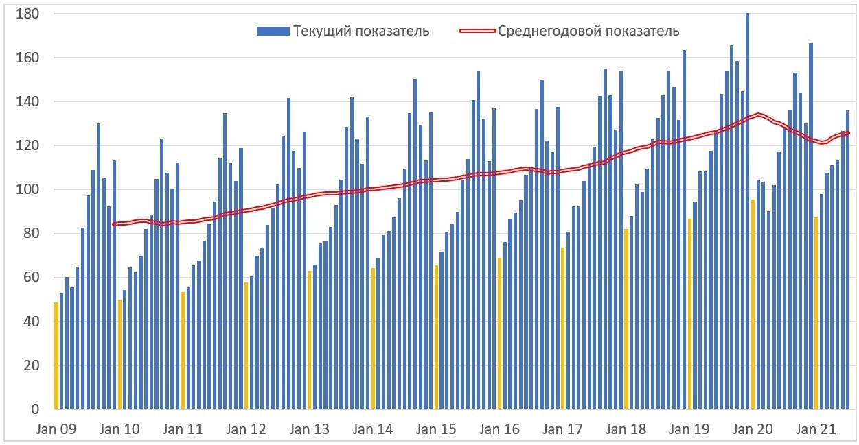 Теперь взглянем на январь. Январь совершенно точно является мертвым сезоном для торговли, и мы видим, что в январе, в пересчете на ноябрьскую торговлю, вплоть до 2015 года покупка товаров была на примерно 12 дней меньше, то есть реально торговля возобновлялась условно с 13 января, когда заканчивались запасы и заканчивались праздники. Стоит, однако, учитывать, что январь в действительности, более пассивный месяц в любом случае и эта сезонность существует и в январе. Ладно январь, но сезонность существует и в феврале, который тоже заметно пассивнее ноября: в среднем суточная торговля в феврале ниже ноябрьской на 20%. Но как бы там ни было, уменьшается «навес» торговли про запас в декабре, уменьшается и недостача в январе. Избыточная торговля на новый 2020 год снизилась до 4.2 дней, а на 2021 – до 2.9 дней. 2021 год – случай особый, учитывая поражение в войне, большинство решило просто праздник не отмечать, но взглянем на график – тренды там вполне очевидные.