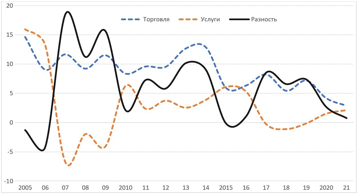 Мы уже неоднократно говорили о сезонности, поскольку декабрь (наряду с сентябрем) является самым активным с экономической точки зрения месяцем: закрываются отчетности, продаются продукты, созданные за год, люди готовятся к праздникам. Торговля в январе ниже, чем в декабре, поскольку в январе несколько дней изымаются из оборота праздниками (хотя, строго говоря, на праздники люди все же выходят из дома). Но чтобы исключить эту сезонность, взглянем на сферу услуг. Там у нас такой разницы как с торговлей нет, хотя тенденции похожие.