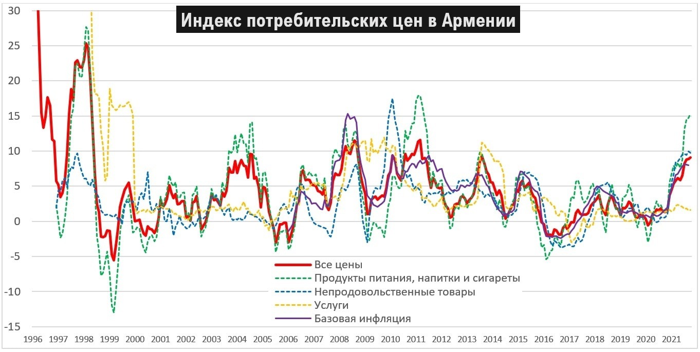 На данный момент инфляция начала превращаться в серьезную проблему в Армении. Она обсуждается все больше и все больше влияет на политическую ситуацию. В октябре 2021 года рост цен составил 9.1% к октябрю 2020 года. Это самая большая инфляция за последние десять лет, в прошлый раз такие цифры фиксировались как раз в первой половине 2011 года и ранее. Тогда, также как и сейчас, список причин был похожим. Рассмотрим его.