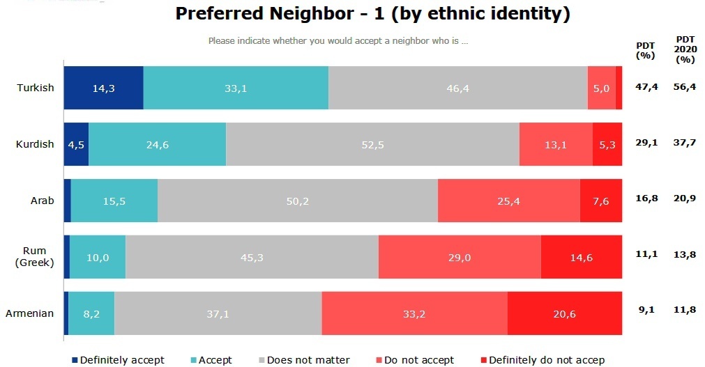 Также, интересно, что большинство опрошенных не хотели бы видеть армян и в качестве соседей, что показывает доминирующую нетолерантную и агрессивную атмосферу в Турции. Причем в последние годы эта тенденция лишь усиливалась. В 2021 году лишь 9.1% хотели бы видеть или допускали соседей-армян, при том, что 53.8% были против. Касательно греков соотношение таково: 11.1% за и 43.6% - против. По арабам – 16.8% за, 33.0% против. По курдам – 29.1% за, 18.4% - против. Что касается турок, то 47.4% за, 6.2% - против. Что касается конфессиональной принадлежности, то христиан в качестве соседей готовы видеть 11.8%, не готовы 43.9%, иудеев – 13.4% против 37.1%, а меньше всего готовы принимать атеистов – 8.1% против 57.3%.