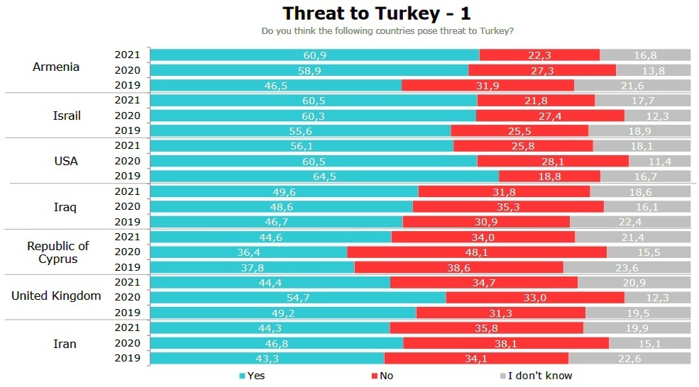 Самое интересное – это то, что в списке врагов и «угрожающих Турции стран» Армения вышла на первое место, обогнав США и Израиль, лидеров списка в прошлом. Врагом Армению считают 60.9% опрошенных, 60.5% считают врагом Израиль, а 56.1% к таковым относят США. Враждебное отношение преобладает также к Ираку (49.6%), Кипру (44.6%), Великобритании (44.4%), Ирану (44.3%), Франции (43.7%), Сирии (42.6%), Греции (42.4%), России (40.7%). В отношении всех остальных стран большее число опрошенных сочли, что эти страны не представляют угрозу для Турции.
