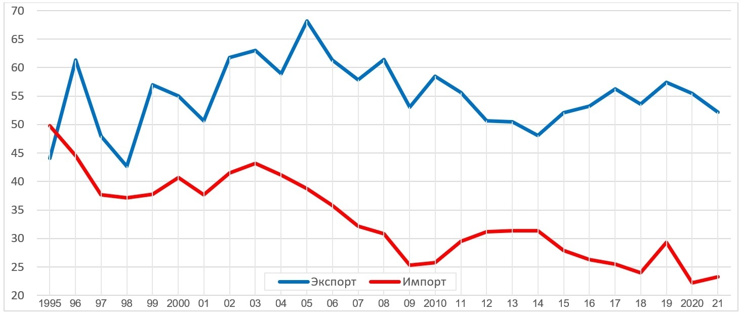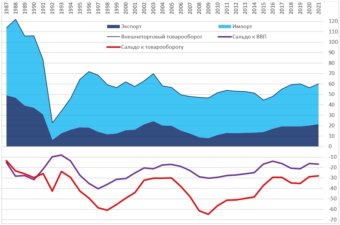 Объем внешней торговли резко сократился в 1991-2 гг., причем как в абсолютном (график 1), так и в относительном выражении. Но изменение характера экономики не произошло одномоментно. Зависимость от импорта росла начиная с 1988 года, и достигла пика, если смотреть по сальдо внешней торговли, в 2009 году, а если смотреть на долю от ВВП, то в 1997 году. После глобального экономического кризиса 2008/9 гг., экспорт стабильно рос быстрее, чем импорт, и в 2021 году отрицательный баланс внешней торговли составил 16.7% ВВП, что соответствует позднесоветским показателям. Но соотношение экспорта и импорта все еще неблагоприятное: импорт преобладал в 2021 году над экспортом в 1.8 раз, хотя это соотношение медленно и стабильно улучшается в последние годы.