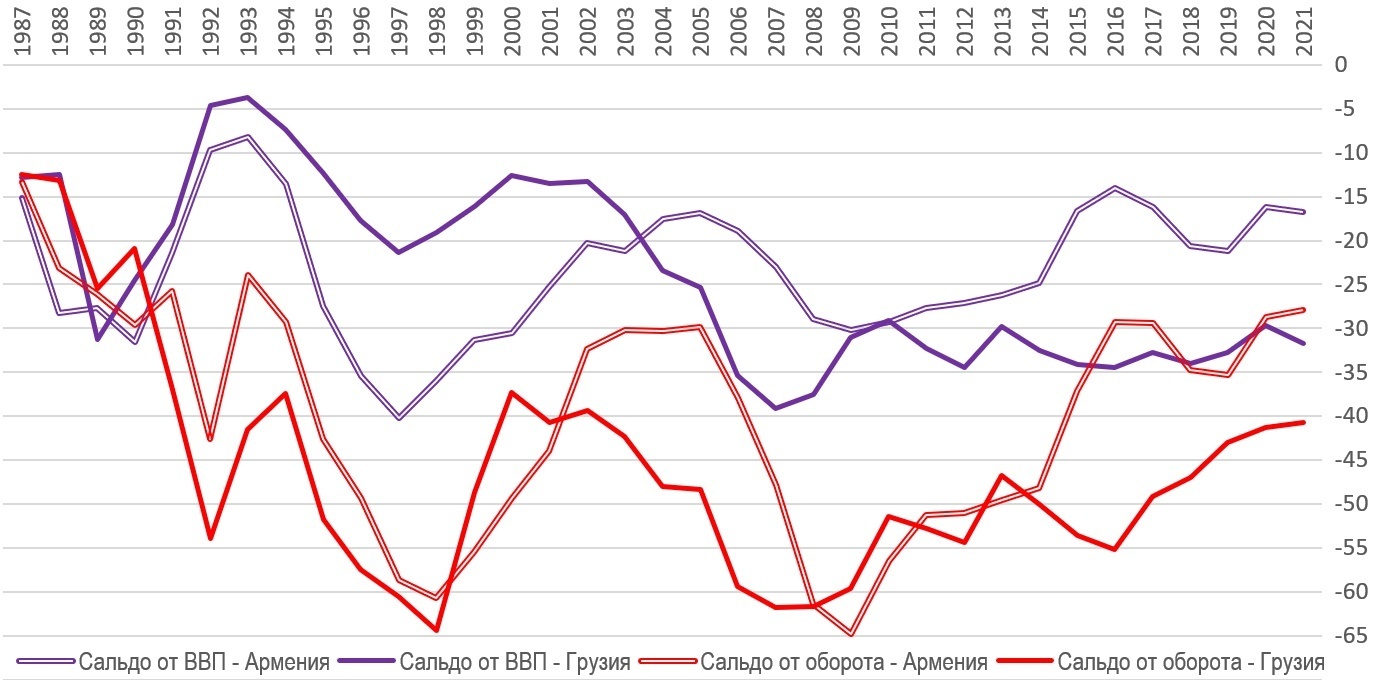 График 3. Сальдо внешнеторгового товарооборота Армении и Грузии (в % к ВВП и к товарообороту)