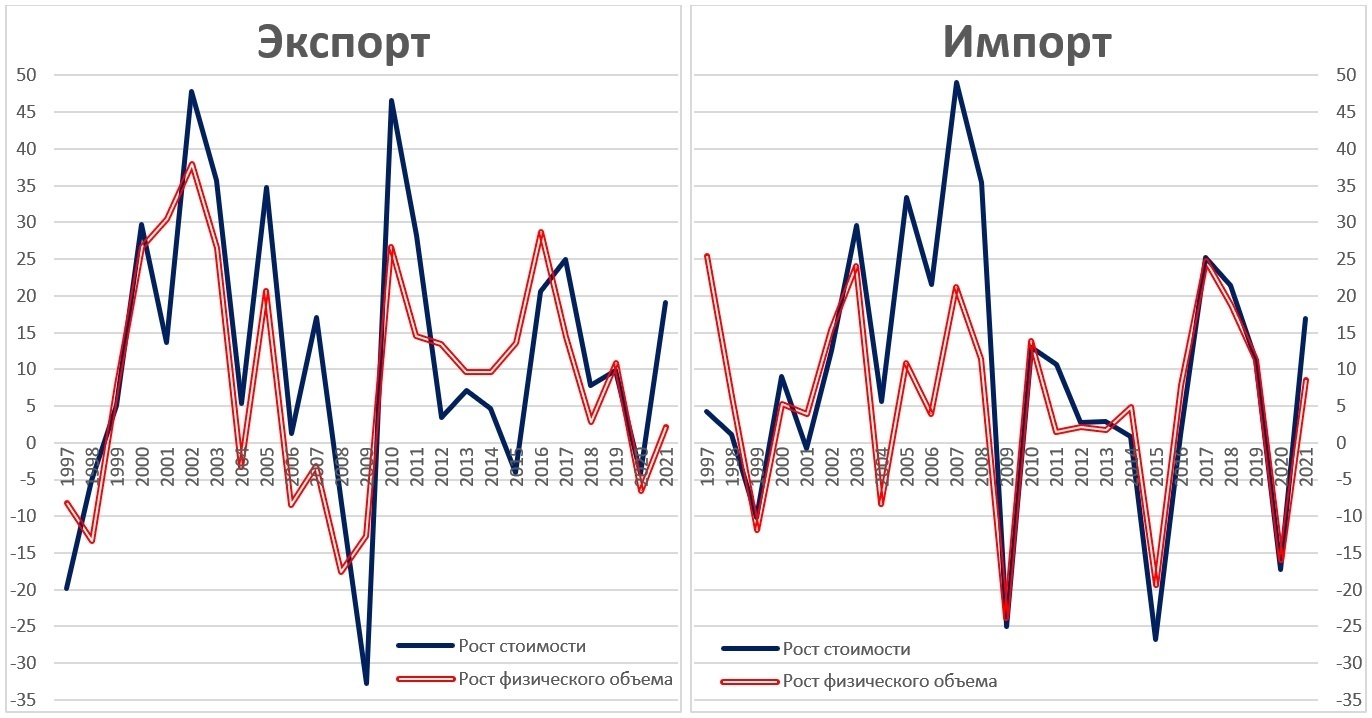 Как мы видим, колебания внешней торговли в стоимостном выражении куда значительнее, чем в реальном (физический объем внешней торговли). То есть, ценовые колебания отвечают за большую часть вариативности данных от года к году. Также, учитывая инфляцию доллара, рост стоимости, как правило, опережает реальный объем торговли. К примеру, в 2021 году экспорт вырос на 19.1%, тогда как в физическом выражении – всего лишь на 2.2%, импорт вырос на 16.9%, в реальном выражении – на 8.6%. Для сравнения, в Азербайджане импорт вырос на 7.7%, причем в сопоставимых ценах – упал на 11.2%; что касается экспорта, то весь экспорт вырос на 67%, а в сопоставимых ценах лишь на 10.4%. Ненефтяной сектор экспортировал на 2.6 млрд долл., рост на 44.1% (реальный рост на 33.8%).