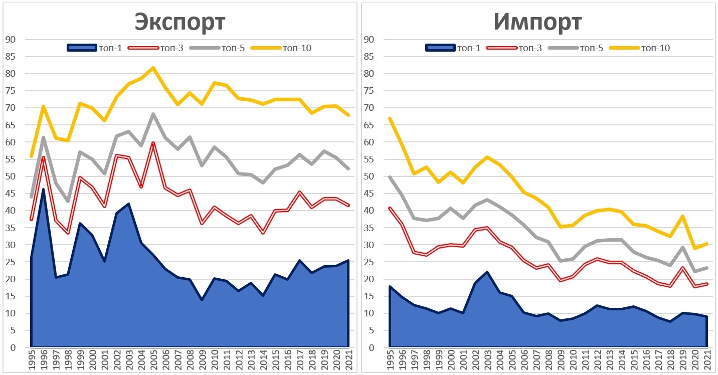 График 5. Уровень концентрации внешней торговли: динамика доли основных товаров, которыми торгует Армения за каждый год, 1995-2021 в ее экспорте и импорте (%)