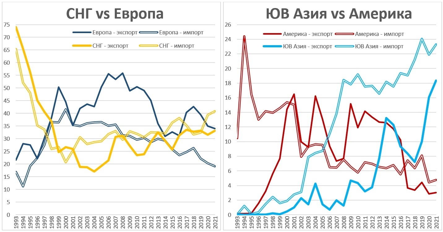 Наиболее интенсивная динамика заметна в направлении стран бывшего Советского Союза и Восточной Азии. Для демонстрации этого, приведем два парных сравнения – СНГ (включая Россию) vs Евросоюз и европейская зона свободной торговли и Восточная Азия и Океания vs Северная и Южная Америка.