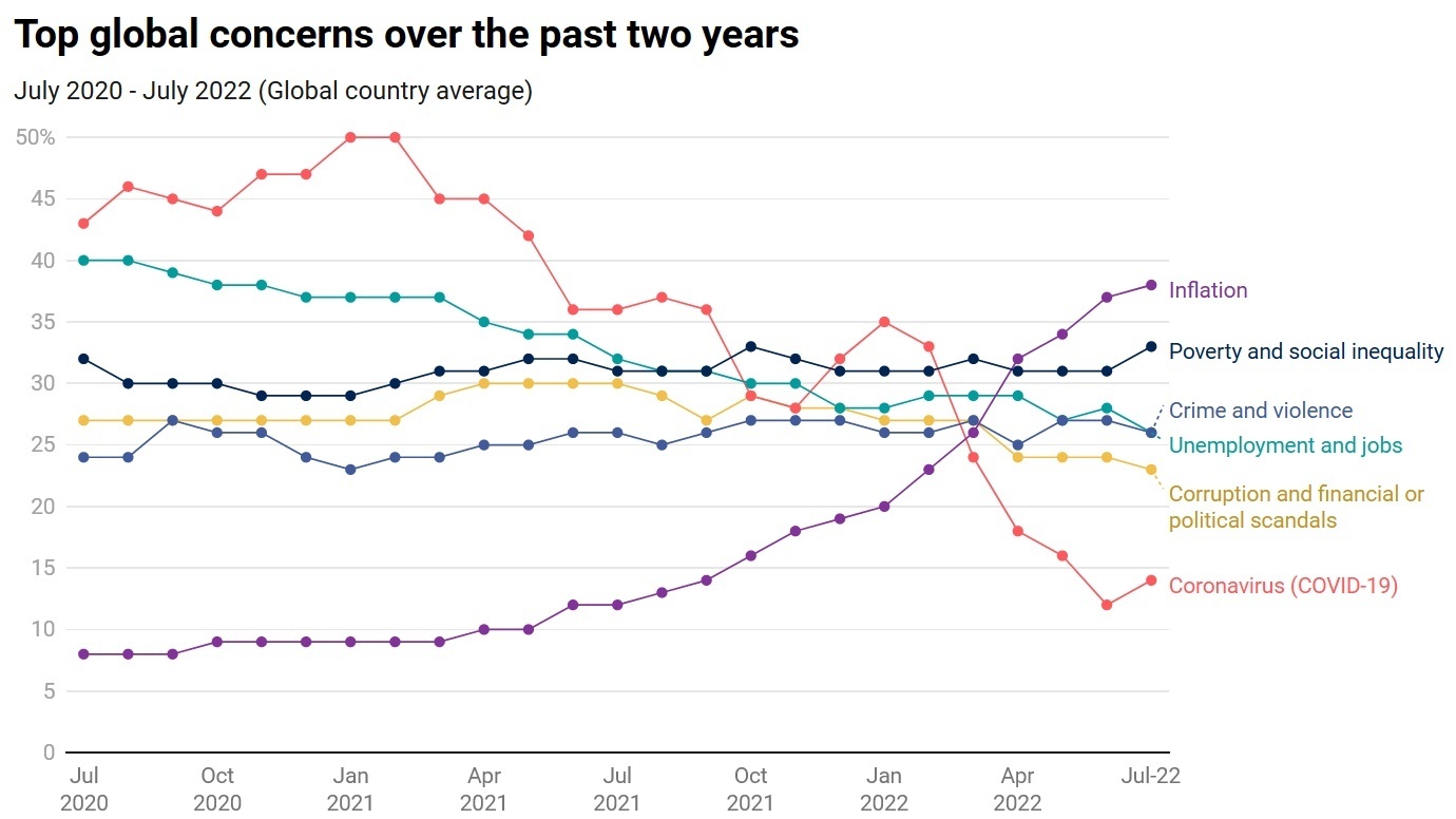 Согласно опросу IPSOS, проведенному в 27 крупных и/или развитых странах, инфляция на сегодня воспринимается как проблема номер 1: среди главных проблем ее назвали 38% опрошенных (в январе 2022 года таковых было 20%, а в марте 2021 года – всего 9%. Учитывая, что большинство проблем в восприятии оставались стабильными, стоит взглянуть на то, что потеряло в значимости: коронавирус и безработица. Взамен, несколько подросла проблема бедности и общественного неравенства: 29% в конце 2020/начале 2021, 31% весной 2022 года и 33% в июле 2022 года.