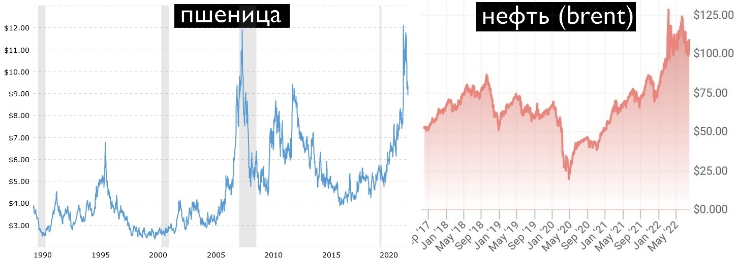 Источники: macrotrends.net, oilprice.com. Единицы измерения: долл/бушель (пшеница), долл/баррель (нефть)