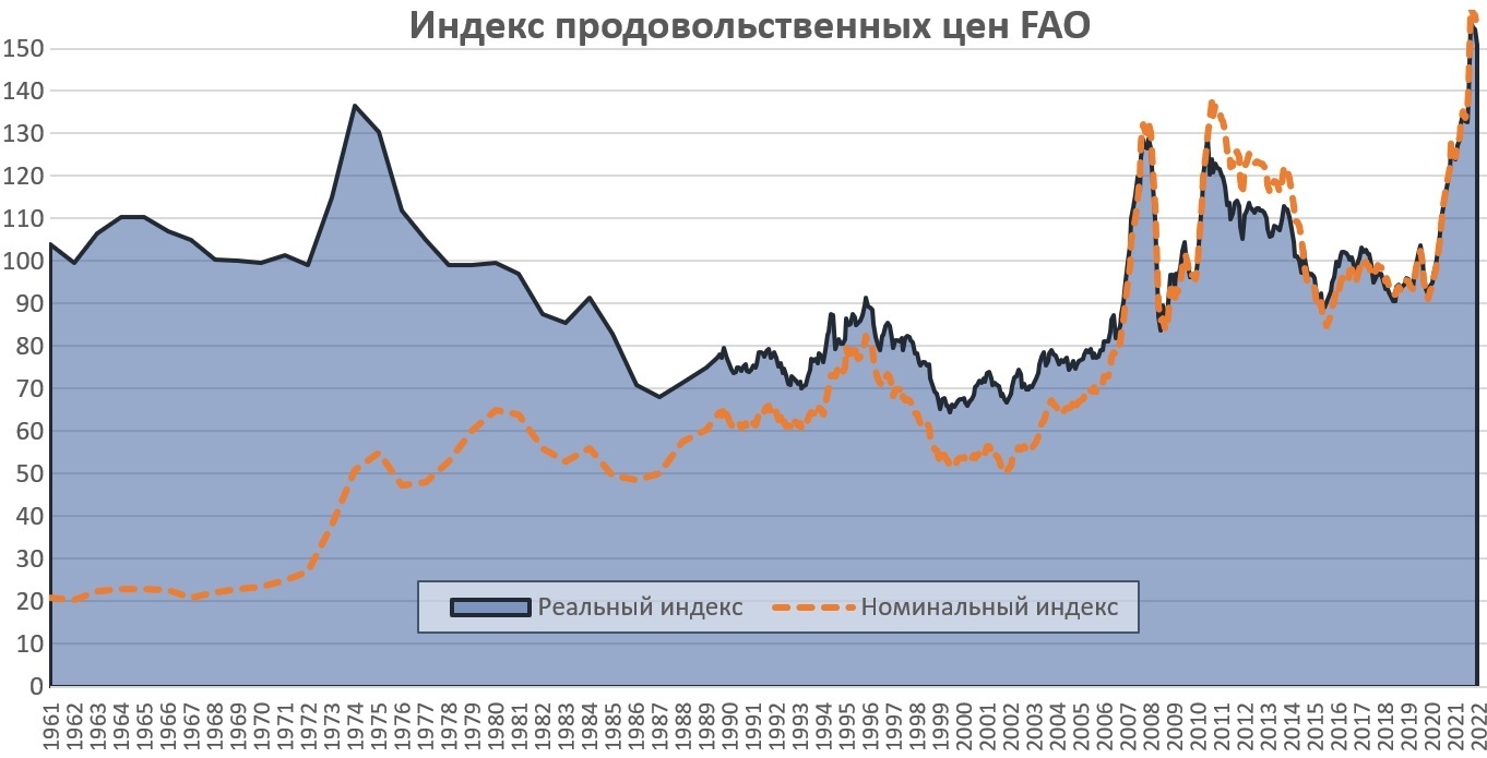 Если же смотреть на международные продовольственные цены, то в этом нам, как обычно, поможет индекс ФАО. Мы можем рассматривать как номинальный, так и реальный индекс. Реальный индекс рассчитывается с поправкой на инфляцию. Но надо учитывать, что цены на продовольствие сами влияют на инфляцию. Таким образом, цены на продовольствие показывают относительную дороговизну еды, относительно всех остальных цен. Взглянем на график в большой перспективе.
