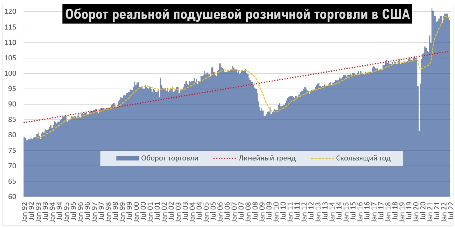Блоггер Spydell обратил внимание, что на потребительском рынке США уже возник серьезный пузырь, причем именно на рынке торговли товарами, тогда как услуги остаются более стабильными (рынок товаров более гибкий и более склонный к перепроизводству). Особенно это касается товаров долгосрочного пользования. Рост продажи товаров долгосрочного пользования происходит в двух случаях: либо при ожидании инфляции и кризиса, либо при избытке наличности. Основной причиной было второе: масштабная эмиссия в 2020-21 гг. привела к отложенному последствию в виде инфляции, что тоже практически стало общим местом. Я решил подойти к проблеме с другой стороны и оценить динамику внутренней торговли в США со всеми поправками. Вышло следующее.