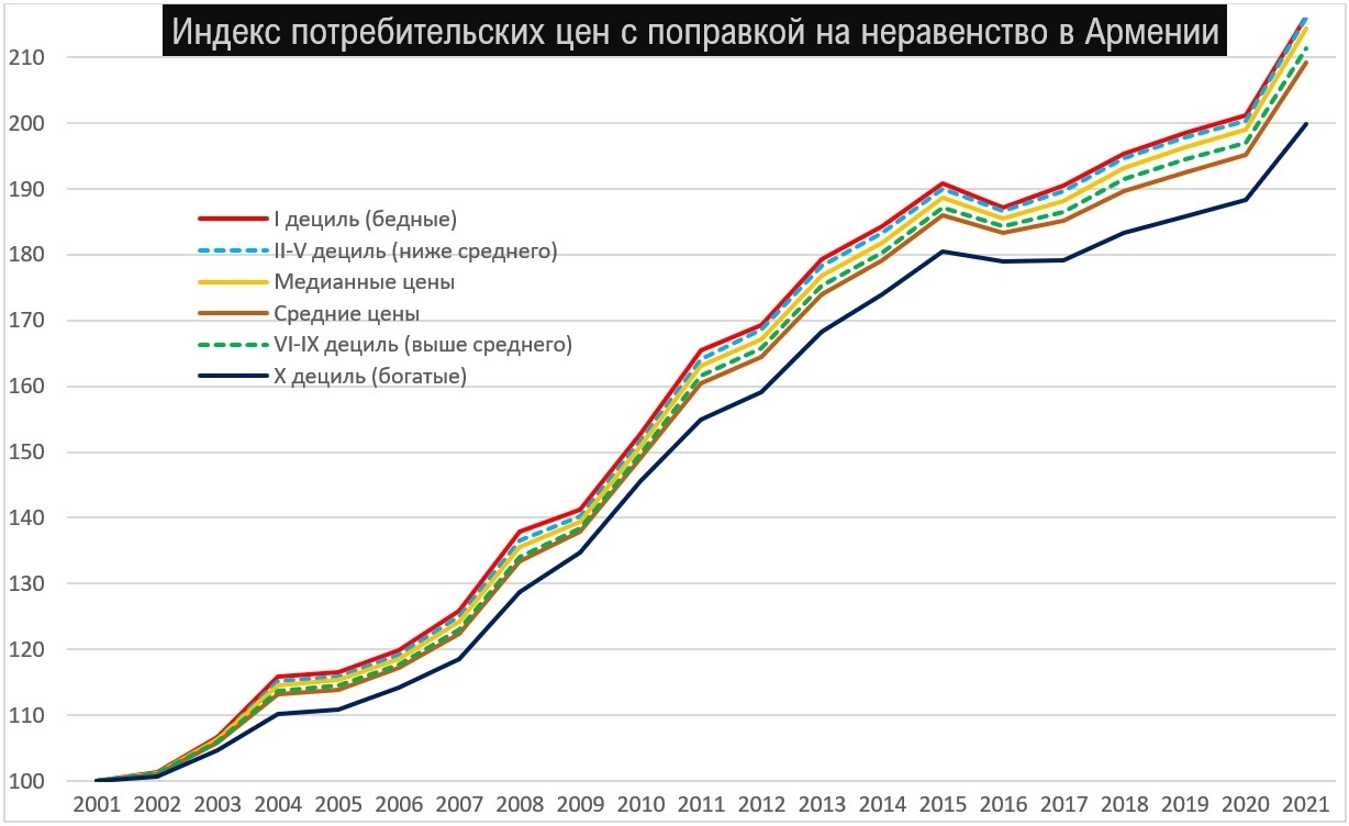 Зафиксированная выше разница – очень существенная и это серьезный аргумент в пользу разговоров о неравенстве как социальной проблеме. Хотя, надо признать и то, что изначальная вспышка инфляции поражает в первую очередь более бедных, а впоследствии переходит на все слои населения, поскольку первым обычно бывает рост цен на продовольствие, а далее растут и другие категории, в частности, непродовольственные товары и услуги. См. также: Текущая макроэкономическая ситуация в Армении (10 июня 2022).